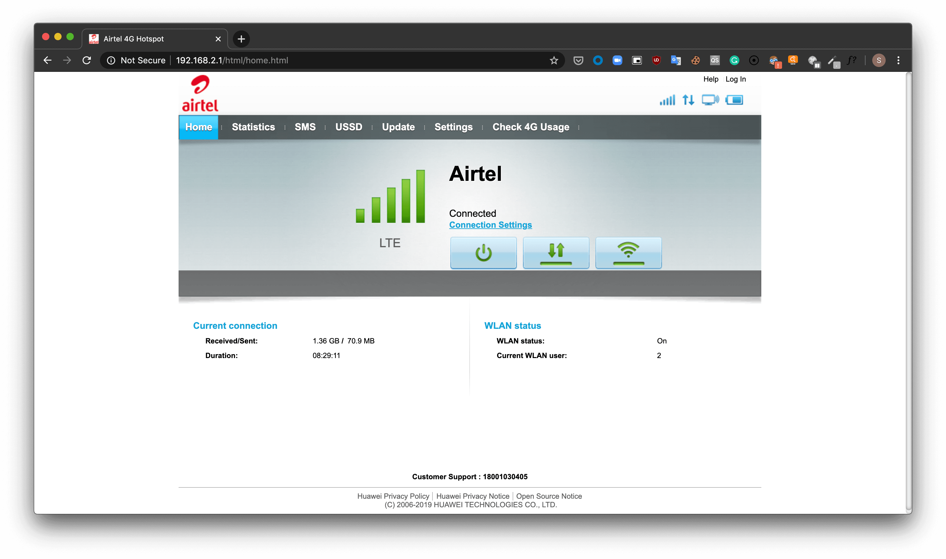 The dongle provides a simple web page to show status and to modify settings, this can be accessed by visiting http://192.168.2.1 The landing page contains basic information showing battery, wifi status and network coverage.